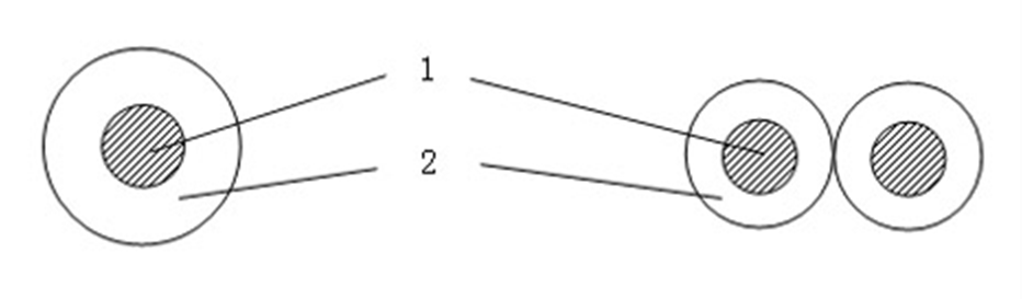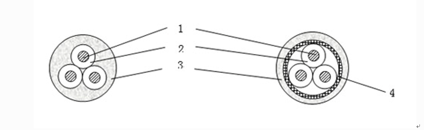 1--- 銅芯導體; 2--- 交聯(lián)聚烯烴J緣; 3--- 聚烯烴護套; 4--- 銅絲編織屏蔽層。
